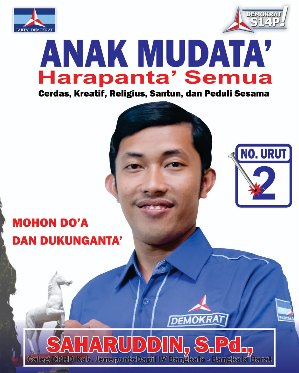 Caleg muda tersebut adalah Saharuddin, S.Pd,Pria Muda kelahiran 1995 ini maju dengan menggunakan kendaraan politik Partai Demokrat.