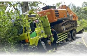 Berdasarkan informasi yang beredar, truk berwarna hijau itu tampak miring ke sisi kiri jalan, dengan bagian roda depan hampir keluar dari badan jalan. Di atasnya, sebuah ekskavator berukuran besar masih terpasang di bak truk, menambah beban kendaraan.